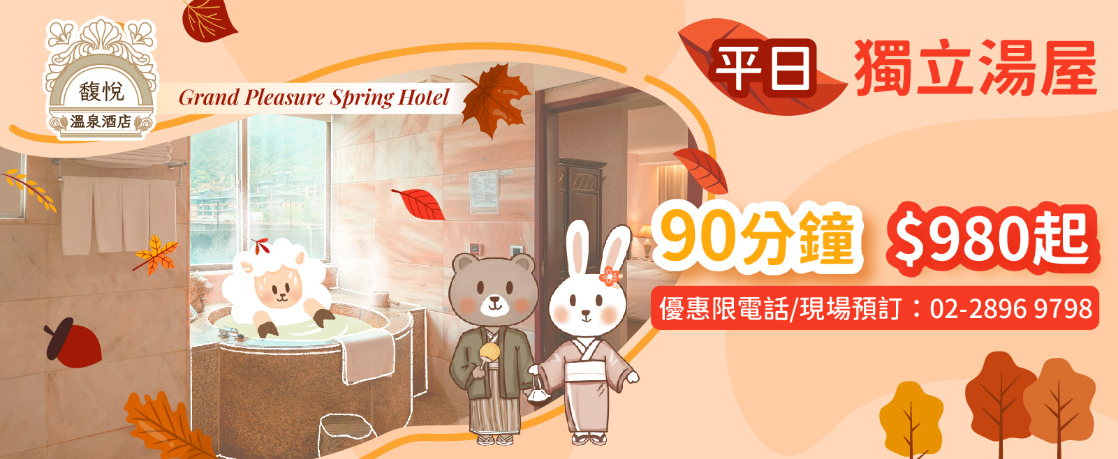 2024 馥悅溫泉季查看所有促銷「溫泉季開跑!!」 獨立湯屋 $980/起(限 電話預訂)電話預約: 02-2896 9798台北忽冷忽熱濕度爆表的秋冬很需要泡泡湯、排排濕氣,在冬季前打好底子趕快來一場說走就走的溫泉與文化一日之旅吧另外還有「樂齡、生日、親子、醫旅」住宿專案歡迎到官方網站逛逛#北投#溫泉旅行#TaiwanTravel#hotspring#taipeitravel#beitou專案活動 查看全部 ▼夏日住宿優惠 Summer Promotion▼Kids Fun童遊專案▼ 樂齡住宿專案▼生日專案 Birthday special▼KTV Party Room 派對房方案2024 馥悅溫泉季▼醫旅健檢專案-首10組優惠▼樂齡住宿專案